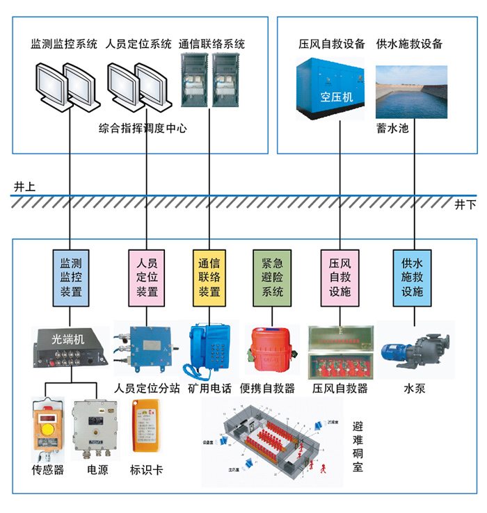 紧急避险系统是紧急疏散系统的总称。包括矿山事故发生后,有关部门和人员为抢救遇难者所采取的一切措施,并能在抢救工作中配置设备和设施。应急对冲系统主要包括相关人员,科学制定应急预案,可以确定受影响地点并正确合理规划避险路线,避免二次灾害。